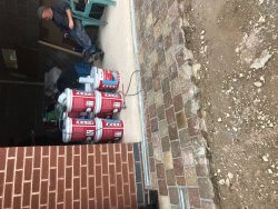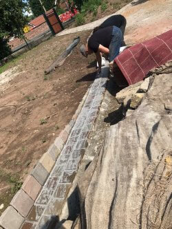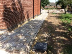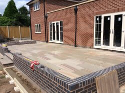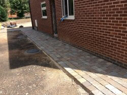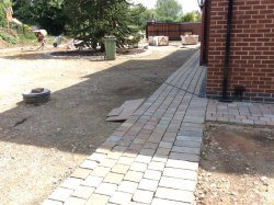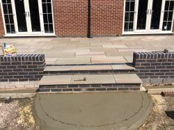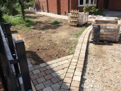 A fantastic new path and patio layed with cobblestone and Indian pave stone slabs underneath a thick bed of concrete for a perfect sub base. Another happy customer